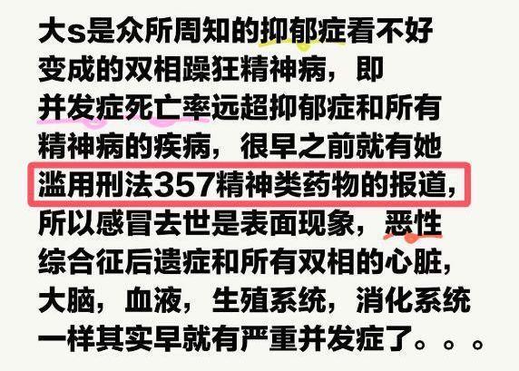 之前大 S 的身体状况就不太好,她有心脏病,还经常癫痫发作,需要长期服药。如果这次她使用了来源不明的药物,那么她去世的原因可能就不只是疾病恶化那么简单了。