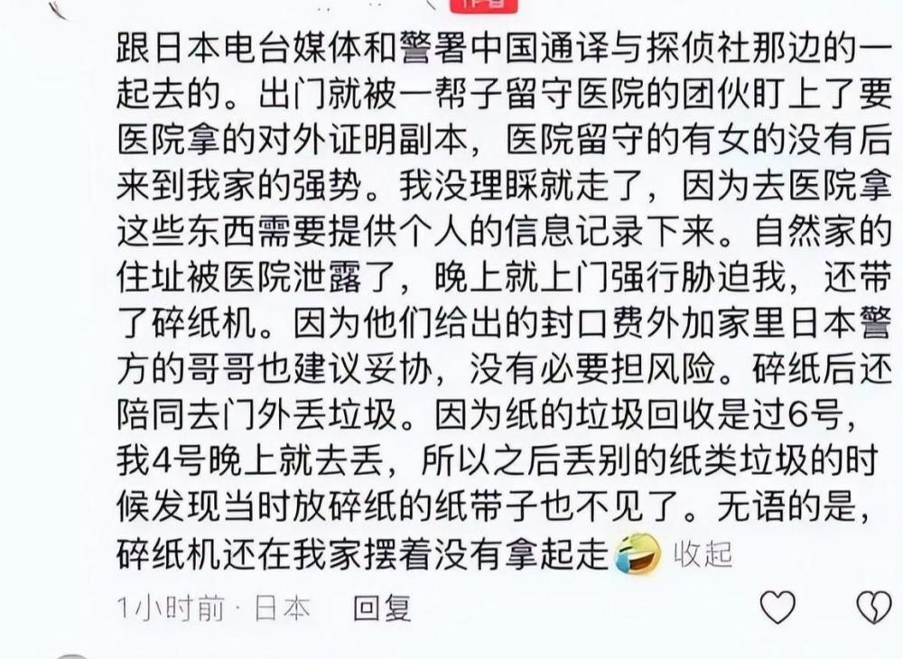 一位日本网友发帖表示,他得到了大 S 的医疗记录后不久,就遭遇了黑帮的威胁。不仅现场被逼着撕毁了资料,还被带到垃圾堆处扔掉,连碎纸机都没收走。