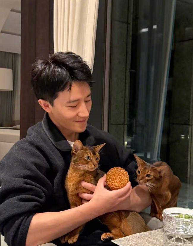 为了让这个节日过得有仪式感,他还抱着自己家的两只猫出镜了,还作出一副要拿月饼喂猫的动作。