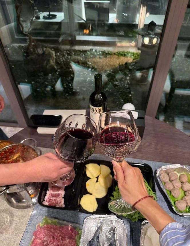 吴晓敏也在黄轩的社交平台出镜了,但是没有露正脸,只是露出了戴着红绳子的手。她和黄轩一起品红酒。