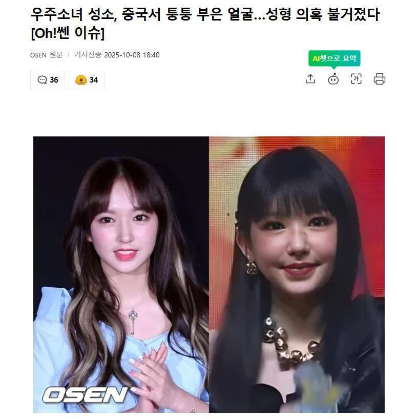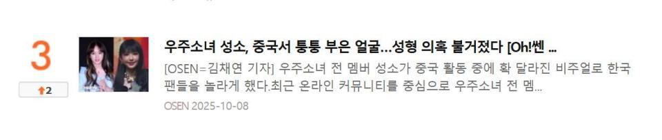 前宇宙少女成员程潇在中国参加音乐节的一组现场照片在韩网引发热议。照片中她面部轮廓明显浮肿,尤其是眼睛、鼻子及嘴角周围状态与以往差异显著,随即被部分韩国媒体冠以 " 整形争议 " 的标签,引发跨国舆论风波。