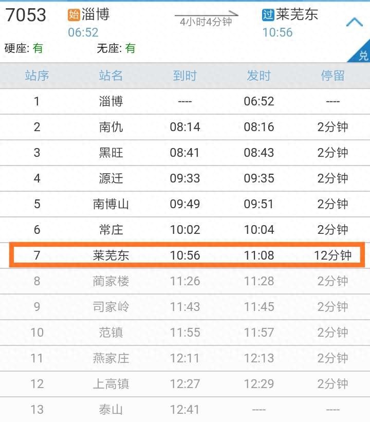 7053次原先到达莱芜东站的时间为10:54分,发车时间11:10分,调整后的到站时间为: 10:56,发车时间为:11:08,在莱芜东站的停车时间由原先的16分钟缩短为12分钟。
