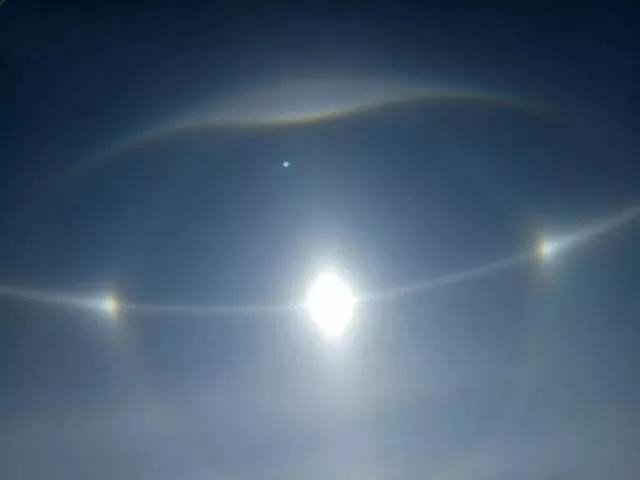 幻日是一种奇观,原来地球上的天空被浓厚的大气层包围,其中也有小蒸汽和小水晶,它们在一定条件下,可变成非常小的木主状的雨滴或水汽,从高空缓缓下降,因受太阳光的照射而产生折时,就形成了幻日。