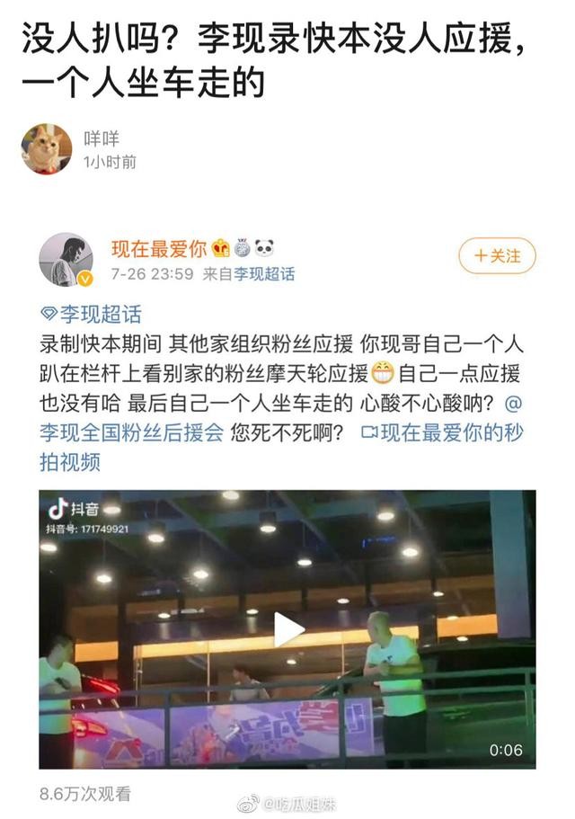然而近日,有八卦博主爆出尴尬一幕,那就是近日李现参与快本录制时却无人应援,最后李现一个人心酸地走了。据悉,事情发生在录制快本那天,场外人头攒动,粉丝在一起围观。李现也驻足了一会儿,不过却似乎并没有发现自家粉丝,而是看见了大批邓伦粉丝的灯牌,有点心酸一个人上车离开了。