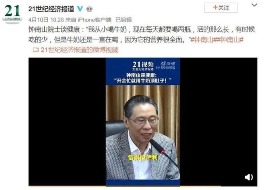 近期网上有一个视频,视频当中的钟南山博士,说牛奶的营养价值高,自己每天晚上都会喝。如果遇到晚上开会,也会带上一瓶安慕希,用来顶肚子。特别是视频的最后说信得过伊利,因为高质量。这个视频在爆出之后,不少的记者采访钟南山先生,问他是不是有商业代言?