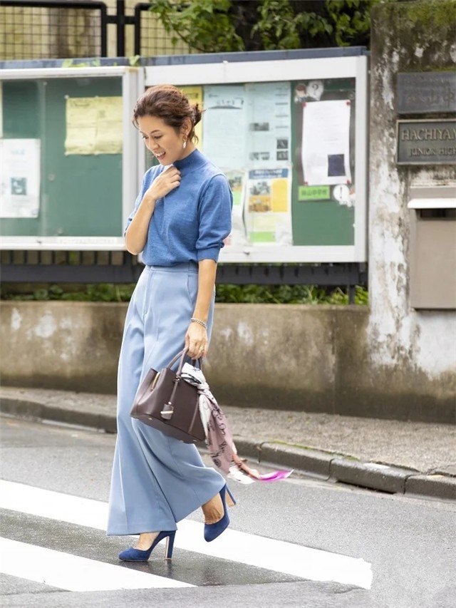 除了黑色、白色和灰色这三种基础款不会出错的颜色之后,还可以根据下半身阔腿裤的颜色来进行选择,在亮色系穿搭中,非常推荐"雾霭蓝"这一颜色,雾霭蓝不仅亮眼吸睛,却不过分明艳,上身之后温柔感极强,将女性的优雅感展现的淋漓尽致。下身选择较浅一点的雾霭蓝,鞋子则可以选择较深一点的雾霭蓝,可以加重整体的层次感和高级感。