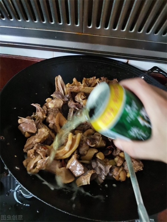 ,翻炒片刻后,将鸭肉下锅,最后加入啤酒。