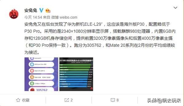 玩懂手机网资讯,根据安兔兔官方发布消息,安兔兔在后台发现了一台华为新机型号为ELE-L29,根据消息这应该是海外版P30,配置略低于P30 Pro,分辨率为2340x1080,采用麒麟980处理器,6GB内存,128GB内置存储,后置4000万主摄像头,前置3200万自拍摄像头,跑分为305762分,和Mate 20系列在2月份的平均成绩较为接近。