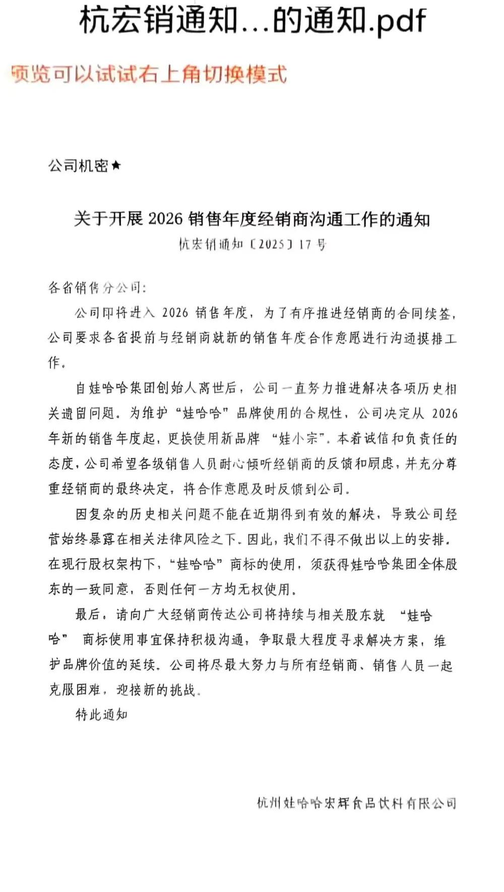 9 月 13 日,一份 " 关于开展 2026 销售年度经销商沟通工作的通知 "(简称 " 通知 ")在网上流传。文件中提到,为维护 " 娃哈哈 " 品牌使用的合规性,公司决定从 2026 年新的销售年度起,更换使用新品牌 " 娃小宗 "。因复杂的历史相关问题不能在近期得到有效解决,导致公司经营始终暴露在相关法律风险之下。因此,我们不得不做出以上的安排 ……