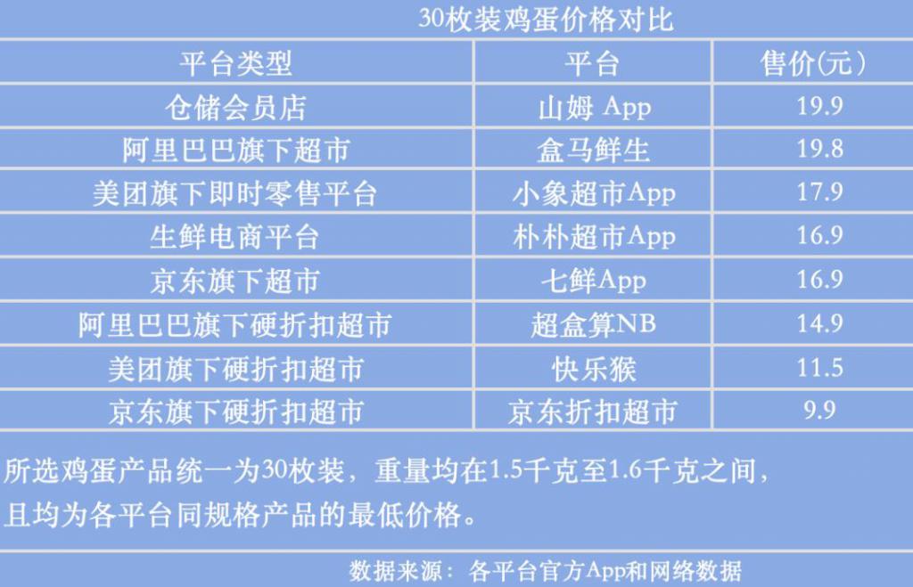 而硬折扣门店中,京东折扣超市 30 枚(约 1.5 千克)鲜鸡蛋仅售 9.9 元;在盒马 NB 线上平台上,30 枚(1.6 千克)鸡蛋的售价为 14.9 元;快乐猴 30 枚装无抗鲜鸡蛋卖 11.5 元,硬折扣超市的鸡蛋价格普遍比其他平台低二至十元。