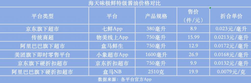 快消品同样有低价优势。以海天味极鲜特级酱油为例,七鲜的 380 毫升装售价为 8.9 元;小象超市的 1.6 升装为 26.9 元;盒马鲜生和物美 750 毫升装的价格分别为 12.9 元、15.99 元。而京东折扣超市线上平台的海天味极鲜特级酱油 750 毫升仅售 9.9 元、盒马 NB 推出 2.51 千克大桶装售价仅 19.9 元,价格明显低于其他超市。