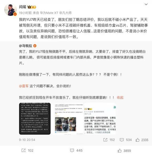 这件事情本身其实非常简单。大概就是一位 YU7 车主在网上抱怨车子总有异响,而且总是查不出原因。随后闫闯就在毫无预兆的情况下转发了这位车主的博文,并说:" 我的 YU7 昨天已经卖了 ",还直接表态以后不碰小米产品。但随后他列举了他认为小米在产品端的问题,比如:碳纤维机盖的虚假宣传、使用车规级纸巾盒却不使用车规级芯片、驾驶辅助事故案例以及车辆异响问题未被妥善解决。