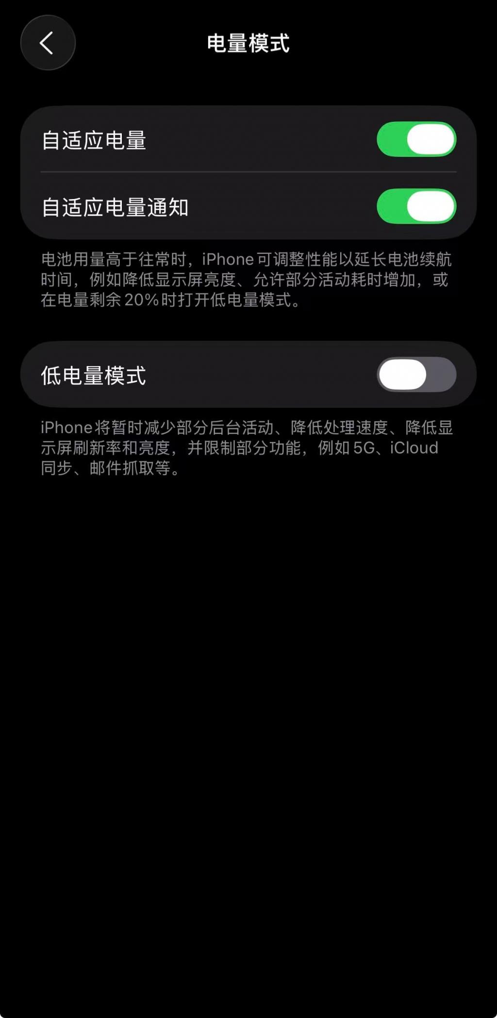 " 自适应电源 " 这一功能的设计初衷是,当监测到用户的电量消耗超出日常水平时,能够自动对 iPhone 的功耗进行调节。具体表现为降低功耗、将屏幕亮度调暗 3%、限制后台程序运行等一系列措施,并且在电量下降到 20% 时,自动开启低电量模式。