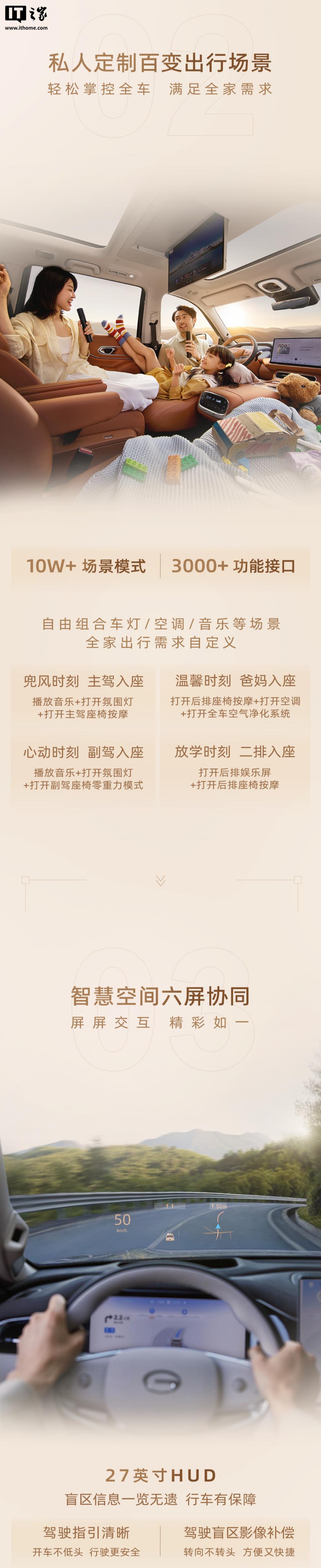 另外,广汽传祺向往 S9 汽车支持 10W+ 场景模式、拥有 3000+ 功能接口,可自由组合车灯 / 空调 / 音乐等场景;车内支持智慧空间六屏协同,配备 27 英寸 HUD(驾驶指引清晰 + 驾驶盲区影像补偿)、17.3 英寸低蓝光护眼娱乐屏(89% 屏占比 / 13.2mm 厚度 / 670nit 峰值亮度 / 莱茵 TUV 低蓝光认证 + 专业护眼 / 3K 分辨率视网膜屏)。