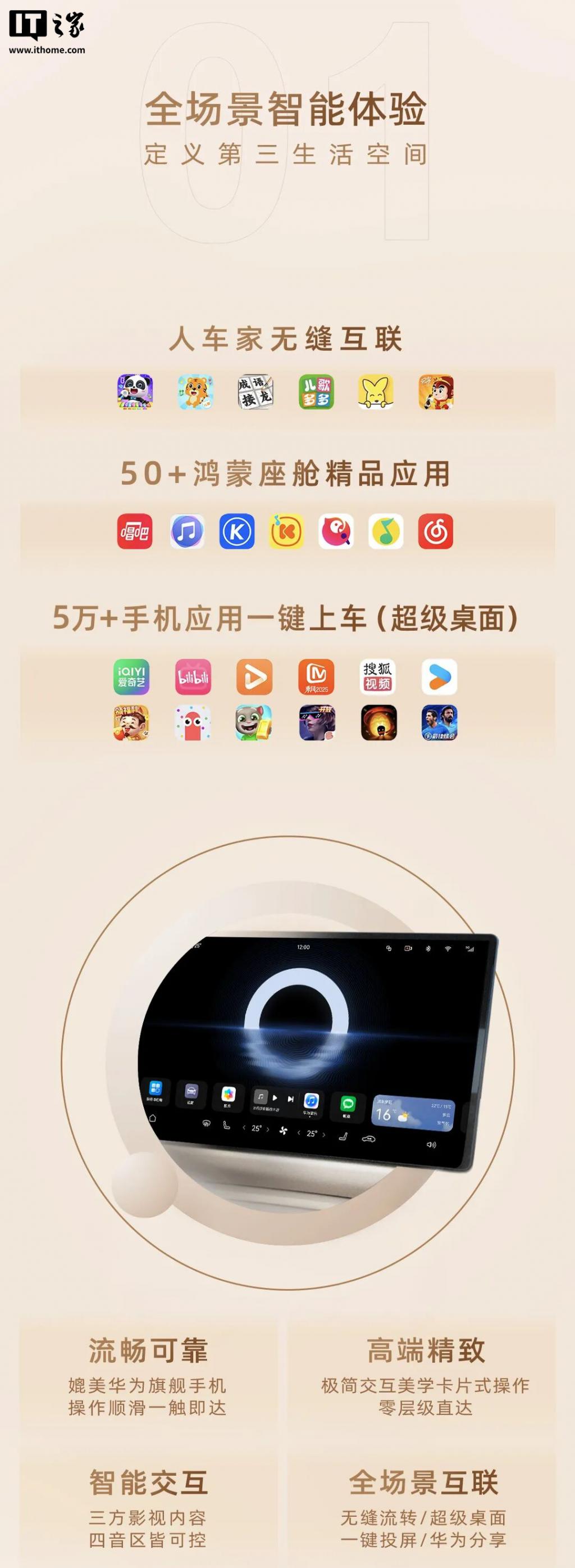 据介绍,鸿蒙座舱 HarmonySpace 5 支持人车家无缝互联、提供 50+ 鸿蒙座舱精品应用、可实现 5 万 + 手机应用一键上车(超级桌面)。具体特性如下: