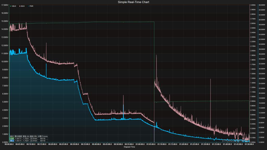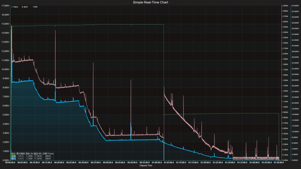 ▲iPhone 17 充电曲线图,蓝色折线为充电功率,红色折线为电流,绿色折线为电压