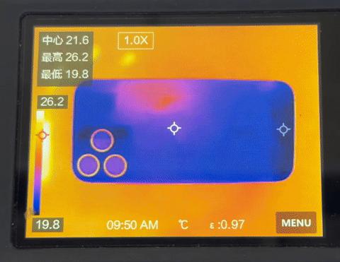 首先是上一代 iPhone 16 Pro Max:从热成像延时中可以看到,16 Pro Max 的发热点位非常集中,主板位置的最高温度接近 45°C,且由于背板玻璃和钛合金中框导热不畅,机身的下半部分始终没有怎么升温,无法有效参与到机身的散热过程中: