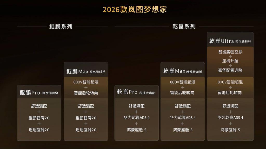 如果把 2026 款岚图梦想家这台「单反相机」看作一个系统,那么鲲鹏与乾崑两大系列,就像是为这个系统配备的两支定位不同的「镜头」。