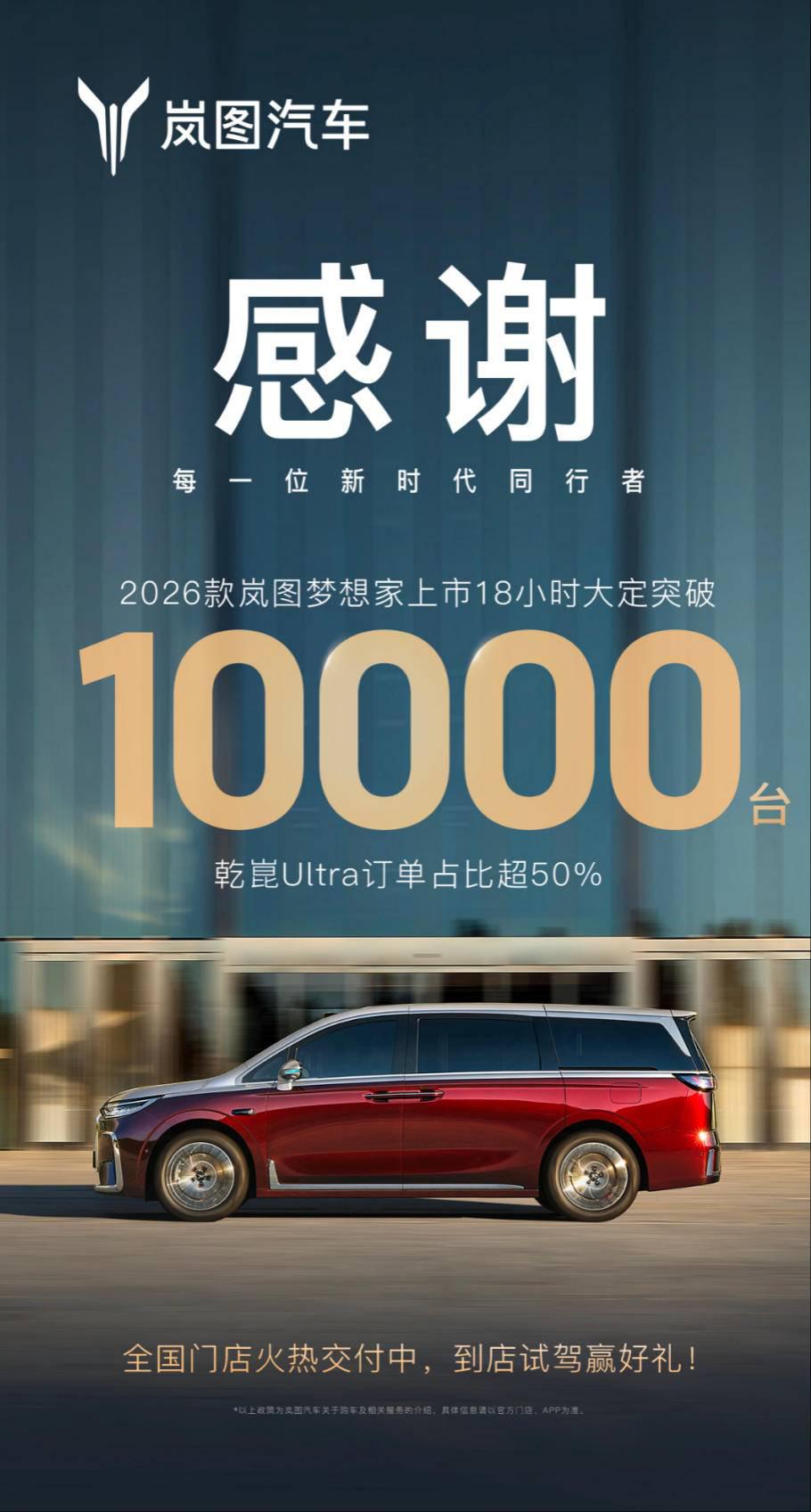 市场的初步反馈,也直接印证了这套策略的成功。上市仅 18 小时,2026 款岚图梦想家的大定订单便突破了 10000 台。更有说服力的是订单结构:作为顶配旗舰的乾崑 Ultra 版,订单占比超过了 50%。