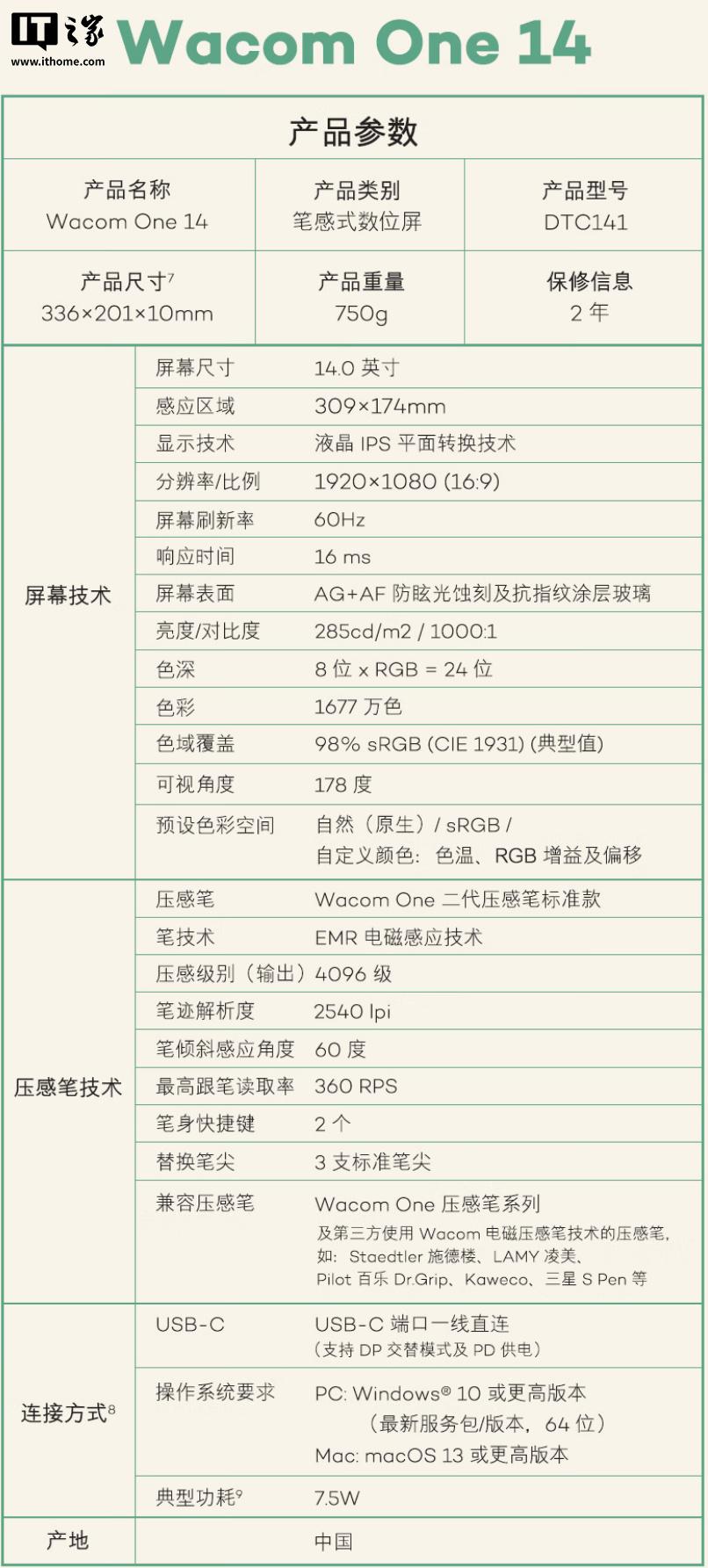 Wacom One 数位屏发布:14 英寸 FHD 全贴合,2449 元