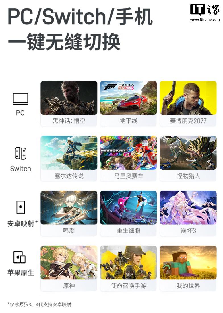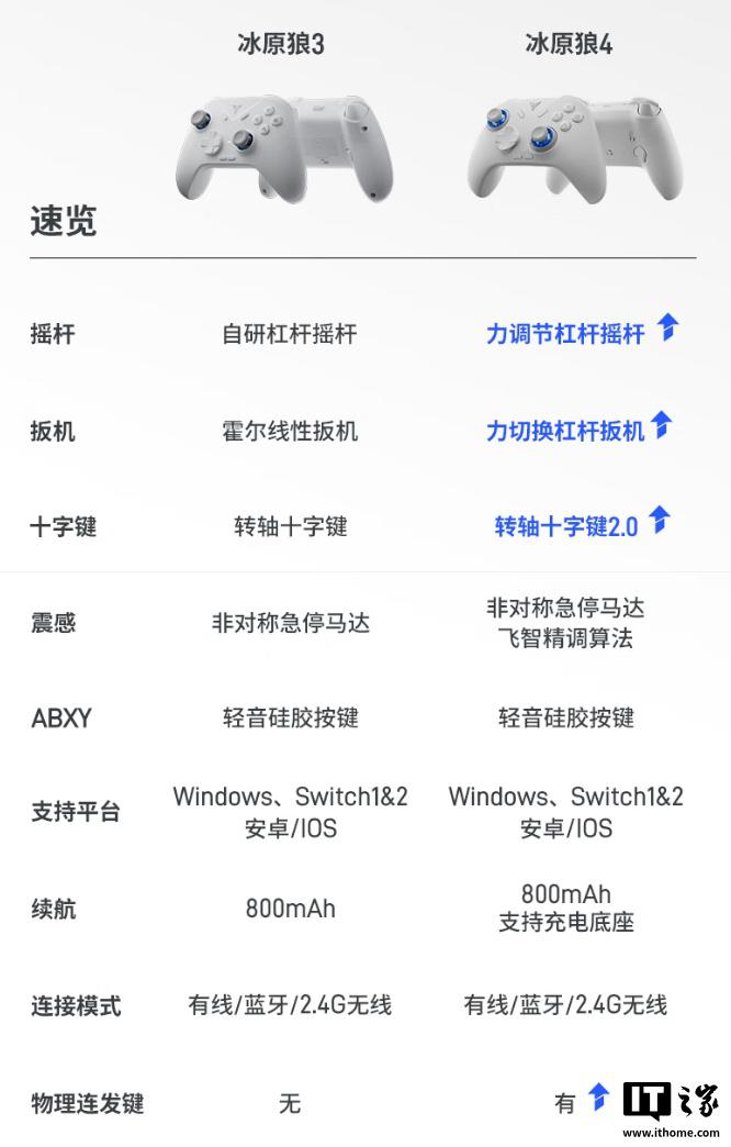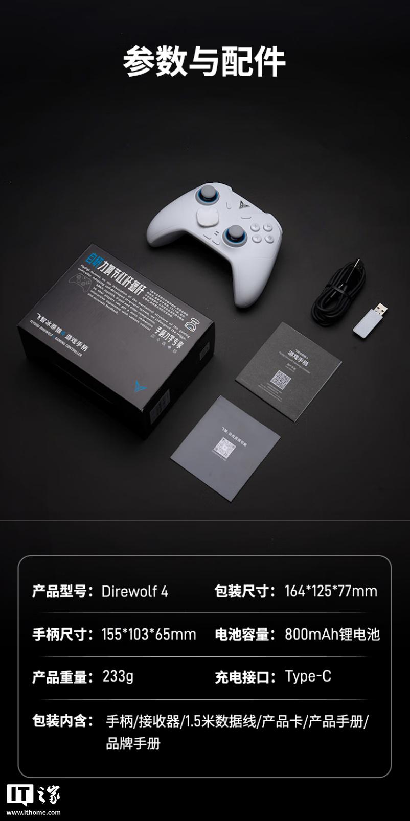 飞智冰原狼 4 游戏手柄支持六轴体感,内置 800mAh 锂电池,可选配无线充电底座,支持使用有线 / 蓝牙 / 2.4GHz 连接,预售价 189 元起,IT 之家附参数表如下: