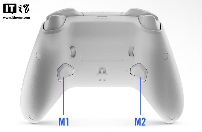 该手柄支持 PC / Switch / 手机一键无缝切换,还可在 PC 端调节多个自定义选项,背部还有两个宏按键。