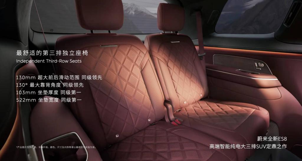 更关键的是第三排,蔚来为其标配了两个带电动调节功能的独立座椅,最大躺角可达 130 °,让它成为真正能够舒适长途乘坐的功能位。