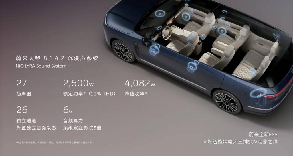 听觉体验上,与 ET9 同款的天琴 8.1.4.2 沉浸声音响系统,由 27 个扬声器单元组成,峰值功率高达 4082W,目标是在车内每一个座位还原录音室级的声场。