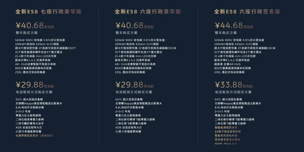 全新一代 ES8 在今晚正式上市,六座及七座行政豪华版车型,起售价 40.68 万元;六座行政签名版,售价 44.68 万元。如果采用 BaaS 电池租用方案,行政豪华版的车价则来到 29.88 万元。