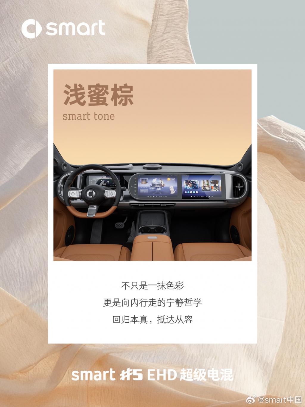 此外,smart 中国昨天放出了一组 smart 精灵 5 号 EHD 官方图,提供了苍岩灰、星漩蓝两种外观配色,以及全新的浅蜜棕内饰颜色。