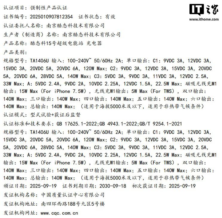 IT 之家 9 月 20 日消息,酷态科 15 号超级电能站(充电器)于昨日通过国家 3C 质量认证,预计会在近期发布。