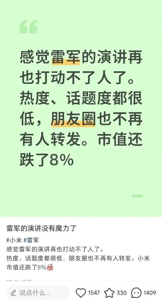 评论虽多,但概括起来主要分成这么几类,一是吐槽小米的产品品质;二是觉得雷军营销过度,而且都是 " 喊苦、喊累、抒情,然后开始带货 ",对此已审美疲劳;三是单纯对这种吃苦奋斗、逆天改命的故事无感了," 雷总累了,大家累了,互不打扰 "。