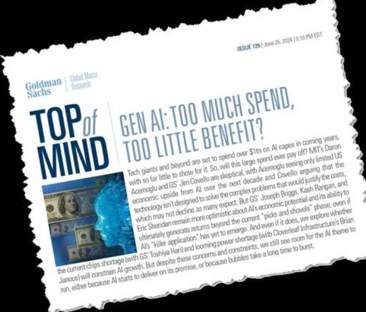 第一次大规模的担忧潮涌现在 2024 年 6 月。当时,高盛发布报告,直指生成式 AI 是否是 " 投入太多,获益太少 " 的资本无底洞,即一个可能永远无法为投资者带来长期正回报的巨坑。这一质疑在科技界投下了一枚震撼弹。