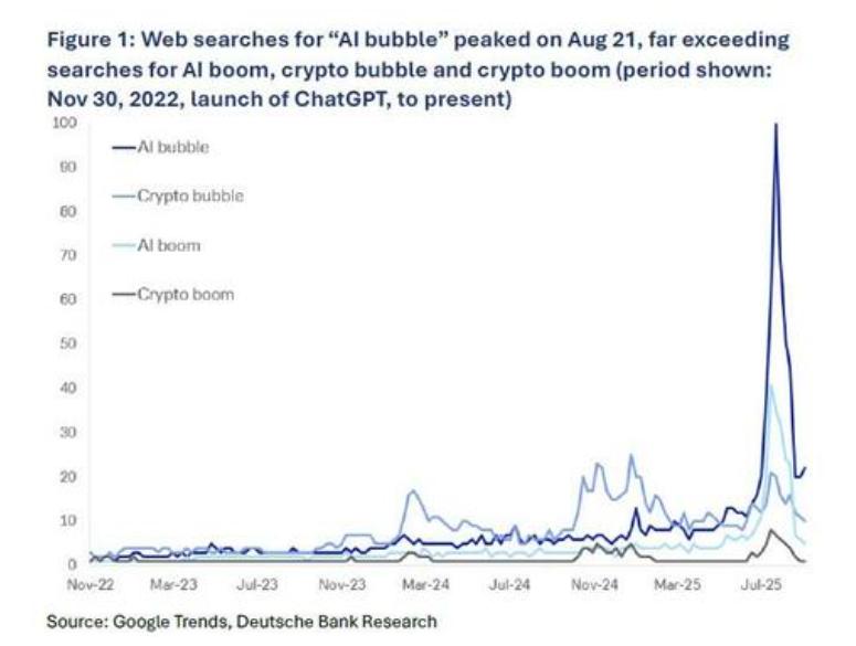 在金融结构性风险日益凸显的同时,关于 AI 泡沫的公开讨论却在降温。德意志银行分析师 Adrian Cox 指出,全球范围内 "AI bubble" 的网络搜索量已从 2025 年 8 月的高点下降了 85%。换言之," 讨论 AI 泡沫的泡沫 " 本身已经破裂。