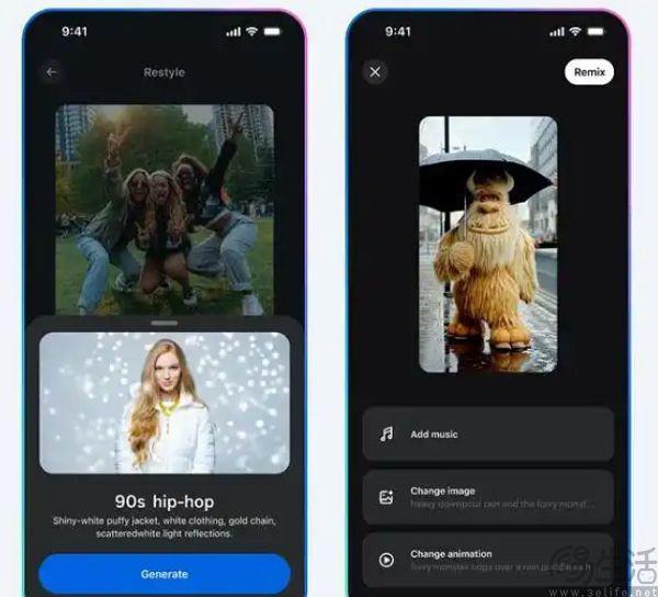 事实上,Vibes 类似于 AI 版本的抖音、快手,为用户提供了动画、特效短片、虚拟场景等 AI 生成的视频内容,并且还支持用户对 Vibes 信息流里刷到的视频进行 " 再创作 "(remix),然后再分享到 Instagram、Facebook Stories。
