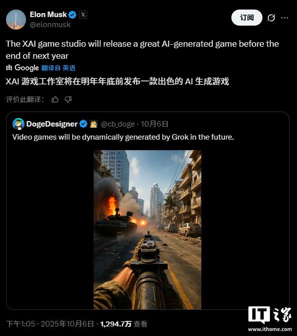 IT 之家注意到,马斯克最近成立了 XAI 人工智能游戏工作室,并声称这支由其 AI 助手 Grok 驱动的团队将在 2026 年底前发布一款 " 杰出 " 的 AI 生成游戏。他是在一条推文中做出这一声明的,配图是一段由 AI 生成的、根本不存在的军事射击游戏画面。