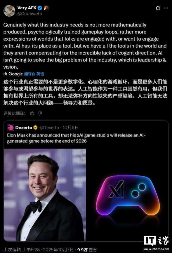 马斯克称明年将发布一款AI生成游戏,Larian Studios发行总监吐槽