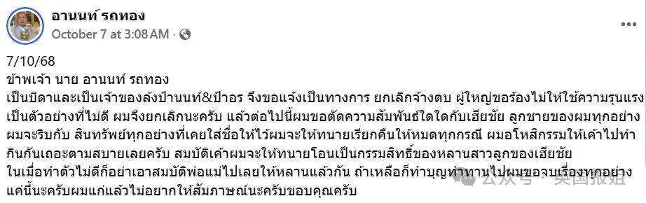 " 本人,阿农 · 罗通,作为父亲及榴莲仓库的业主,现正式宣布:取消雇人打人的决定。