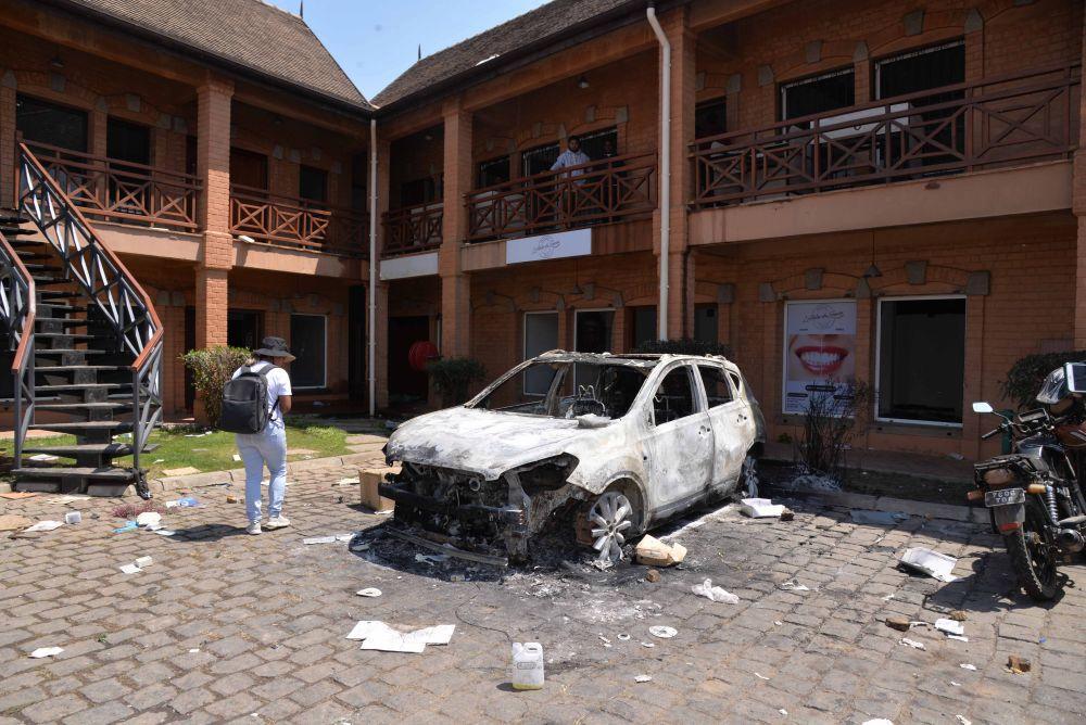 9 月 26 日在马达加斯加塔那那利佛商业区拍摄的被损坏的汽车和商铺。图源:新华社