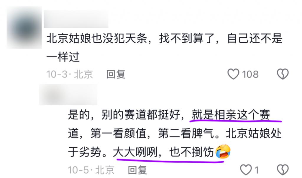 可到了婚恋这场暗流涌动的局里,光是 " 有里有面儿 " 远远不够。当男男女女都在修炼推拉话术,苦练欲擒故纵的技能,北京姑娘往往第一个被拍上岸。