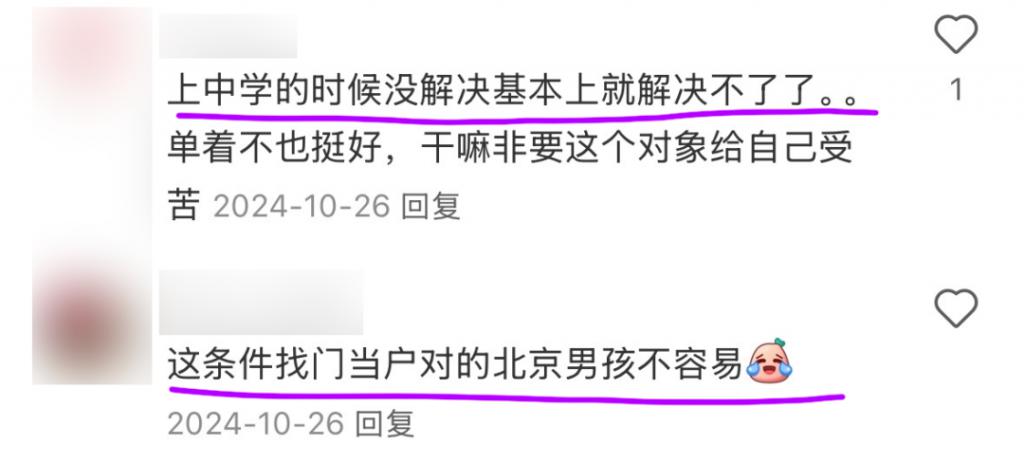 " 条件比你好的,压根不 care 户口在哪儿,尤其那些老家几代积累的县豪门,反而觉得北京户口是束缚;条件不如你的,天大地大哪不能闯,何必为你困守一方;剩下那几个门当户对的北京男生,早就被抢得差不多了。"
