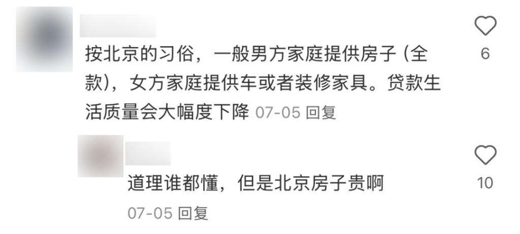 大晨晨表示,北京人结婚没有彩礼一说,原本婚恋门槛并不算高。" 大多数土著家庭默认的嫁娶规矩,是男方出房、女方配车,而且好商好量,很多女方也愿意平摊首付、房贷、装修费用 ……"