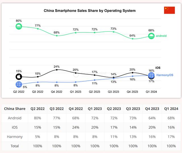 根据 Counterpoint Research 的研究报告,2024 年一季度,鸿蒙以 17% 的市场份额首次超越苹果 iOS。