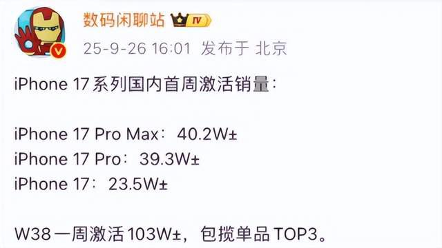 华为虽然在 9 月初发布了新款 3 折叠屏手机华为 Mate XTs,一经上市便引发抢购,但随着苹果 iPhone 17 系列的超预期表现,直接抢走市场关注度。根据博主 @数码闲聊站 爆料,iPhone 17 系列国内首周激活量达到了约 103 万台,直接包揽了单品销量排行榜前三。