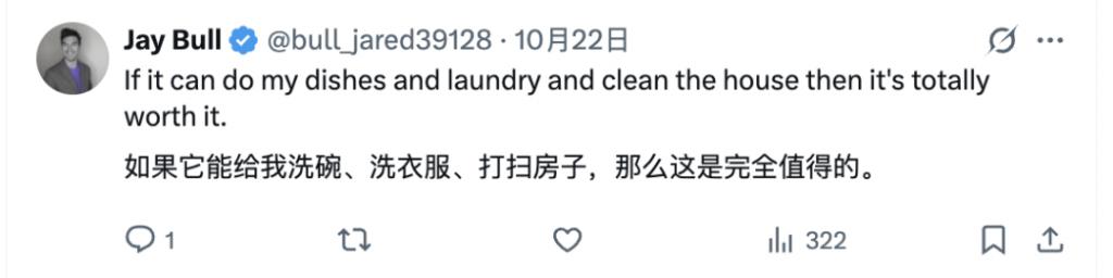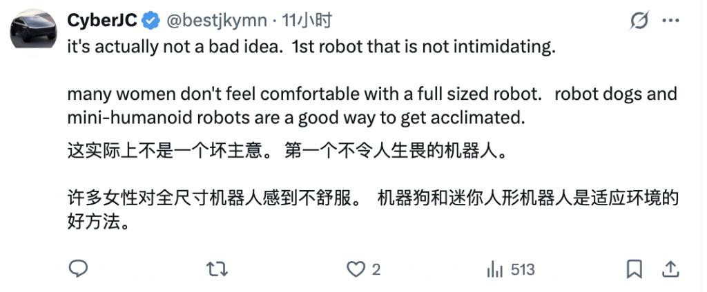 比如这个网友提到,像 Bumi 这样 mini 尺寸的机器人可能对女性更友好,不会那么令人生畏: