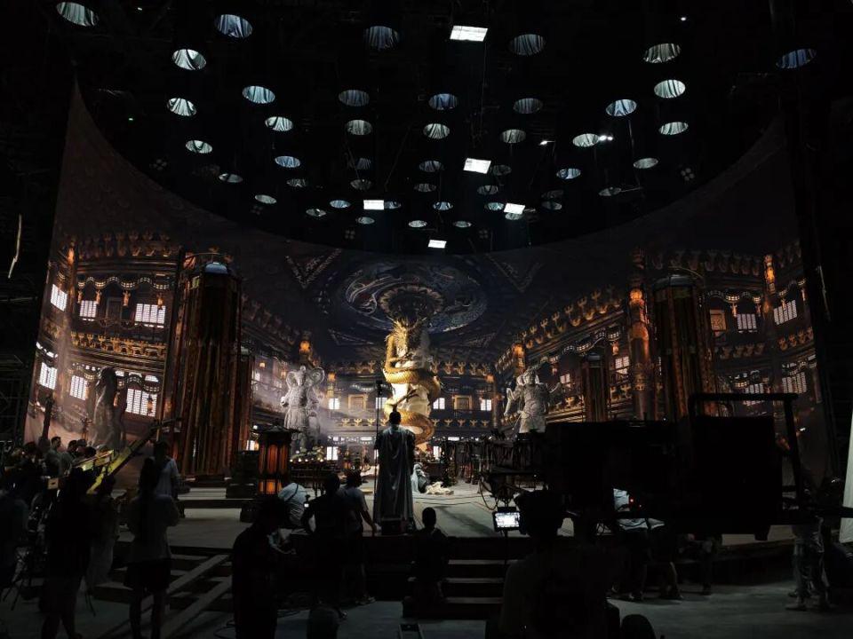 一场金龙殿的戏,乍一看那大殿别提多雄伟,但事实上,除了法幢、宫灯、烛台、桌子还有一些小道具是实体的以外,整个大殿,包括天王雕塑、绕着金龙的柱子,全都是假的。