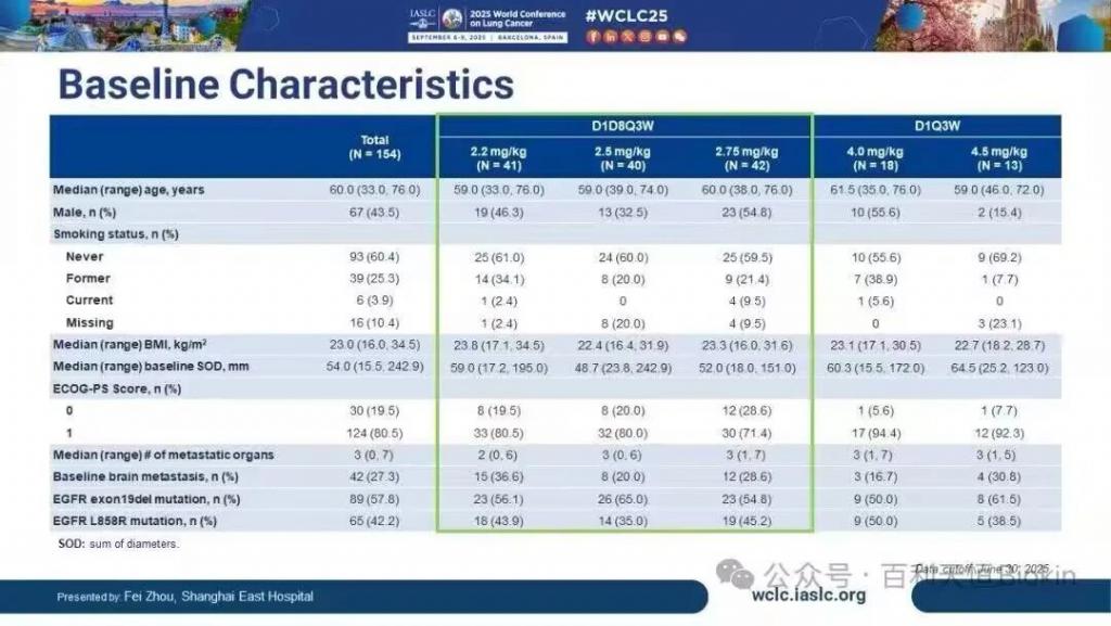 朱义:首先需说明,我们这项Ⅱ期研究共入组了 154 例患者,目的是探索不同剂量 iza-bren 联合奥希替尼的最佳推荐剂量和初步疗效,其中,最终被确定为最佳推荐剂量 2.5mg/kg 组的患者共 40 例。当然这项研究也顺利达到了研究终点,我们确认了 iza-bren 联合奥希替尼的最佳推荐剂量,也看到了联合治疗的积极疗效信号,也正是基于此,我们顺利拿到了关键注册Ⅲ期研究的临床批件,目前国内Ⅲ期已启动并在快速推动患者入组。