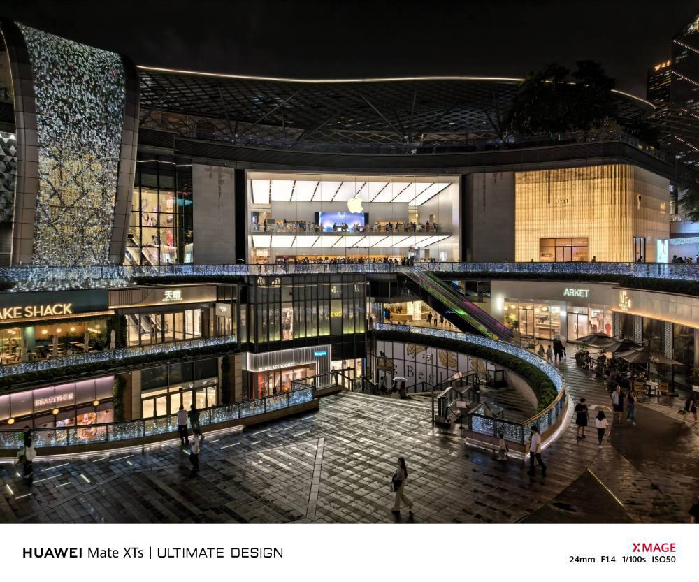 夜空下,商场室外复杂的人造光源最能够考验手机影像系统对高光压制、HDR 合成、感光、色彩还原等方面能力。Mate XTs 非凡大师在弱光场景中,突出的其实是色彩。