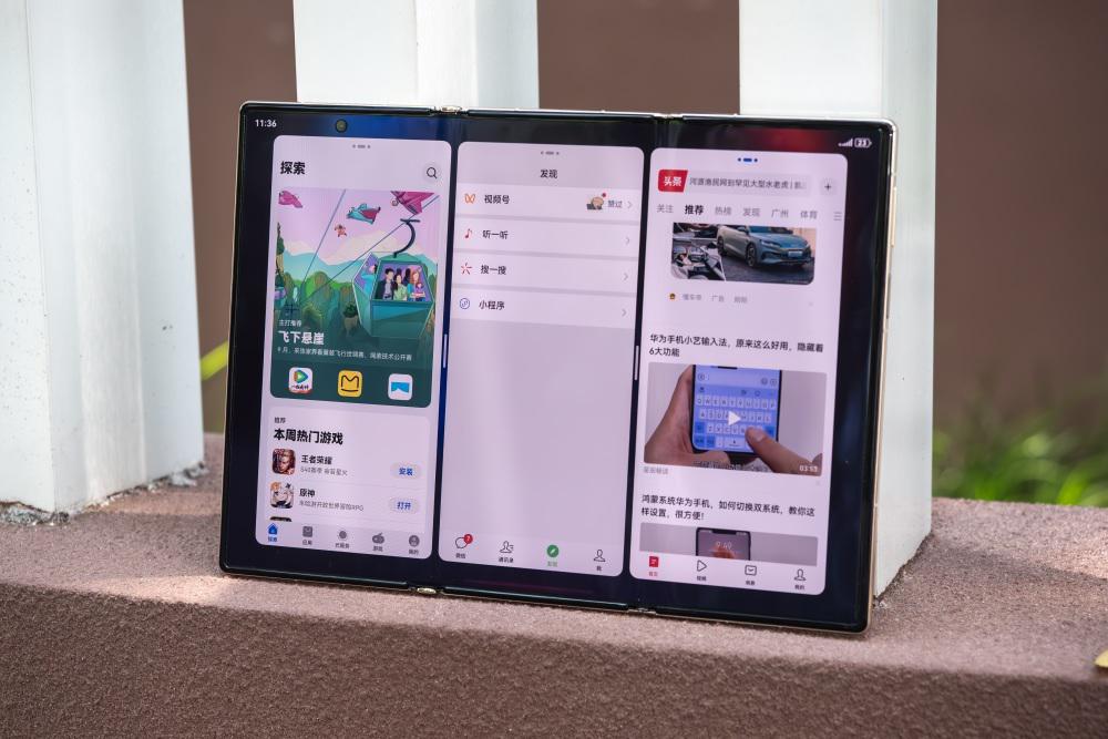而 Mate XTs 非凡大师这次强调的还有一个三窗并行的特性,三个应用同时用,也可以根据需求对窗口的显示比例进行调节,但目前有一部分 App 还不支持窗口缩放。