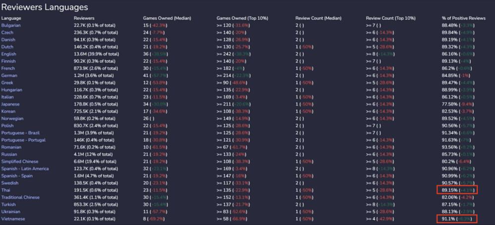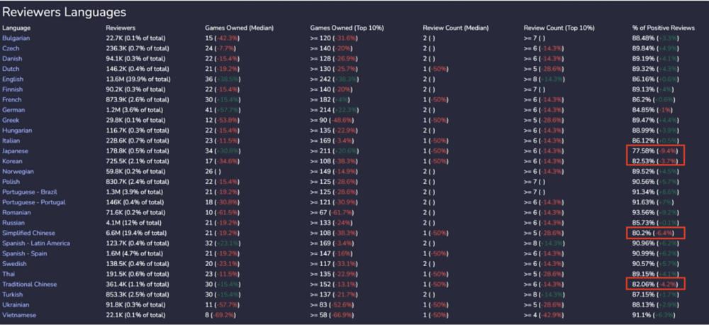 事实上看数据的话,好评率最低的是日语、简中、繁中、韩语,因此我觉得最主要的还是文化因素。与其他文化圈相比,泛儒家文化圈一直不太有鼓励式教育的传统,大家比较吝啬自己的赞美。在游戏评价上面的表现就是,只有特别好的游戏我才愿意去给好评,但是游戏只要稍微有点问题我就愿意去给差评。我觉得这才是好评率差异最大的因素。